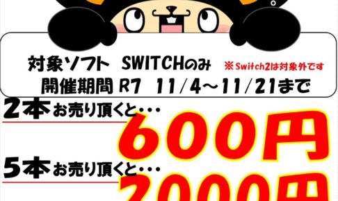買取情報お得情ぉぉ報ぅぅ!!!! R7 11月04日~11月21日まで SWITCHソフトのみのプラスアップを開催いたします!!!!! 同一タイトルは2本まで対象、3本から対象外となりますのでご確認ください。#お宝中古市場山形天…