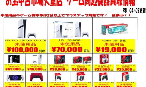買取情報ゲームハードの買取価格更新いたしました!! 未使用は2台以上でプラスアップ対象ですので是非お持ち込みください!! pic.twitter.com/89Z6e6nhhb — お宝中古市場山形天童店ゲーム (@OtatenG…