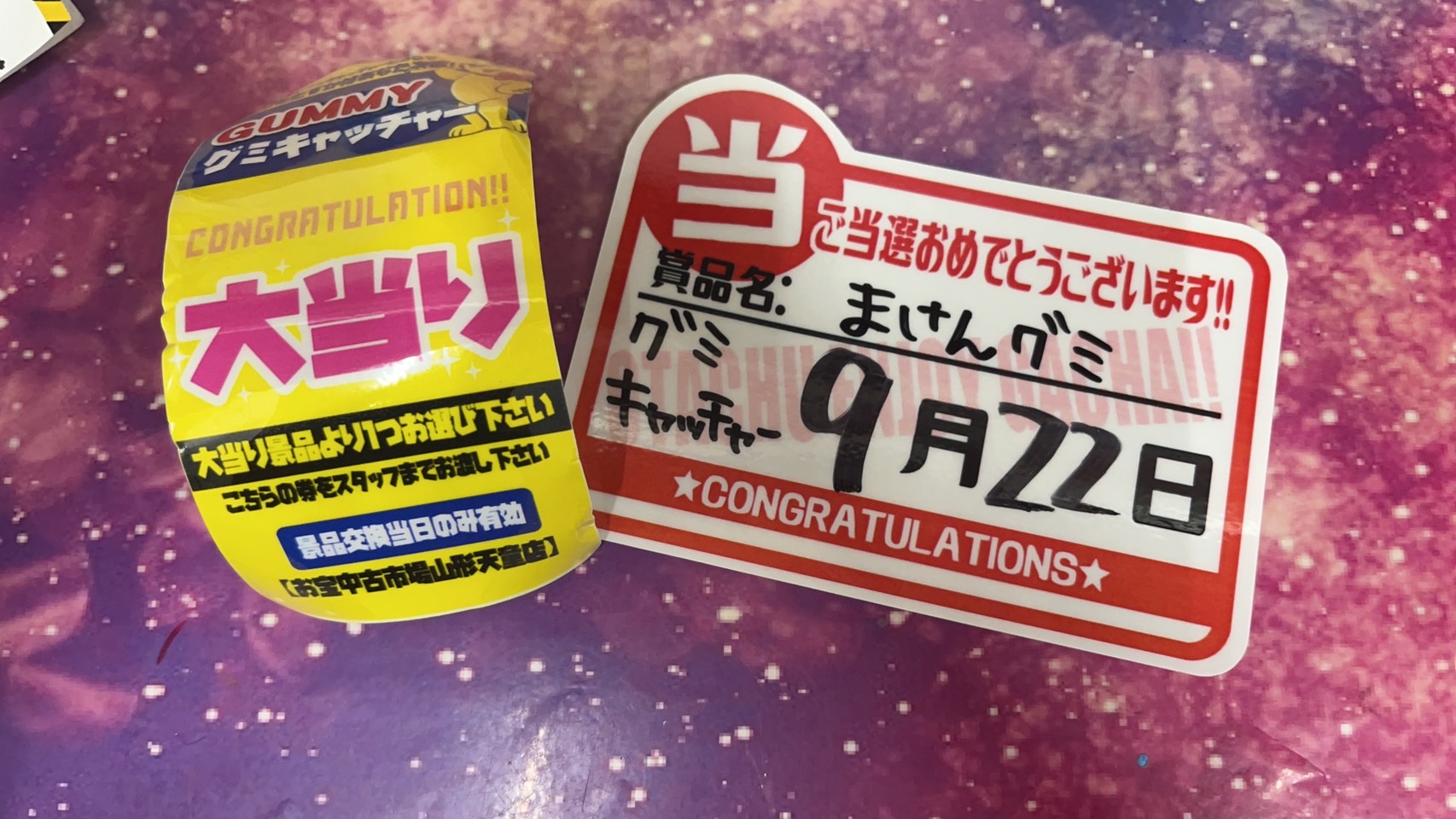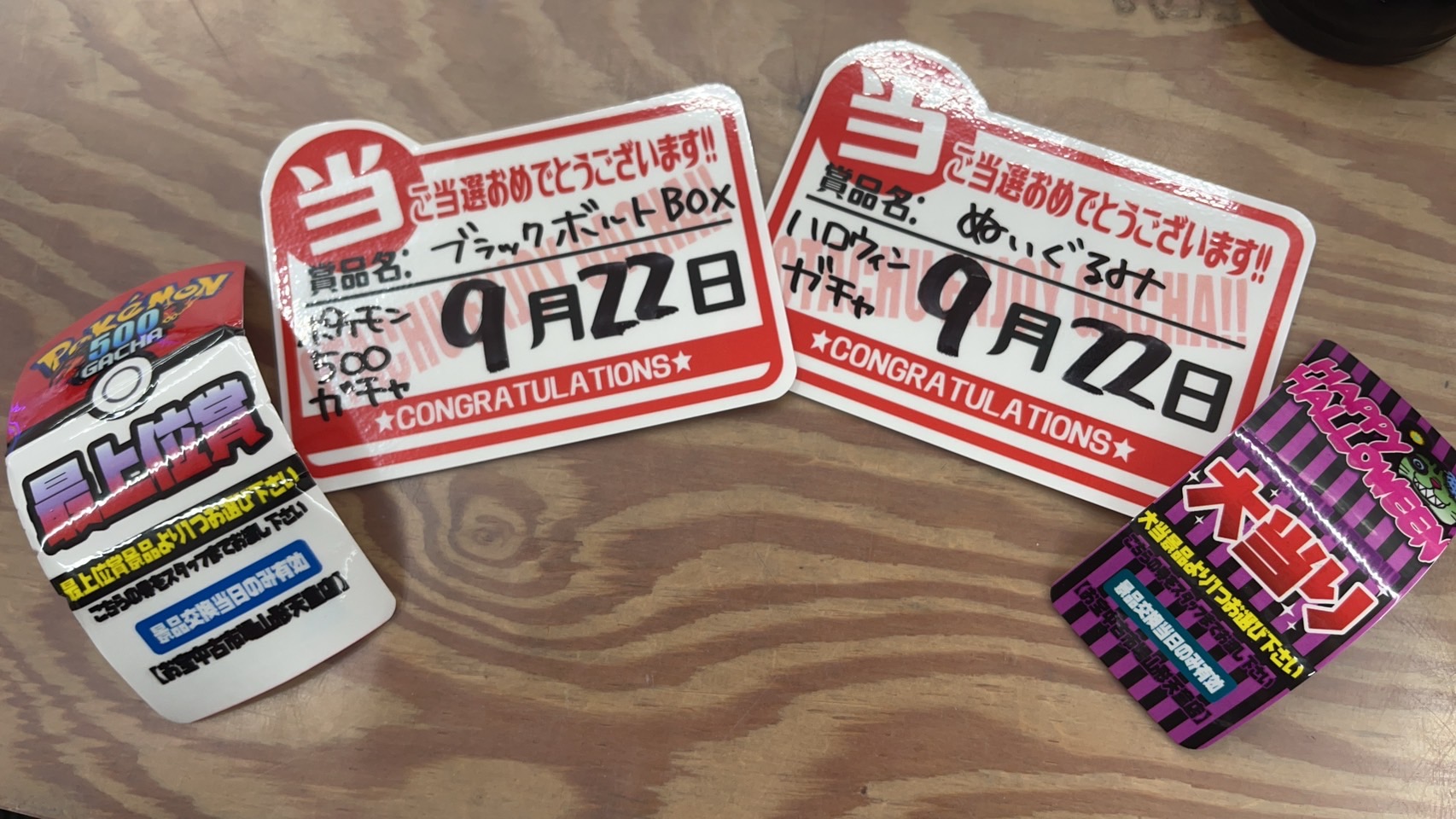 ■《ポケモン500ガチャ》最上位賞&《ハロウィンガチャ》大当りでましたー! 他■ 2025年9月22日 ★お知らせ★ 《ポケモン500ガチャ》最上位賞&《ハロウィンガチャ》大当りでましたー!! おめでとうございます🎉👏 釣具ガチャ A賞でました!! おめでとうございます🎉 《グミキャッチャー》大当りでましたッッッ🍭❤️❤️ ご当選おめでとうございます🙌✨