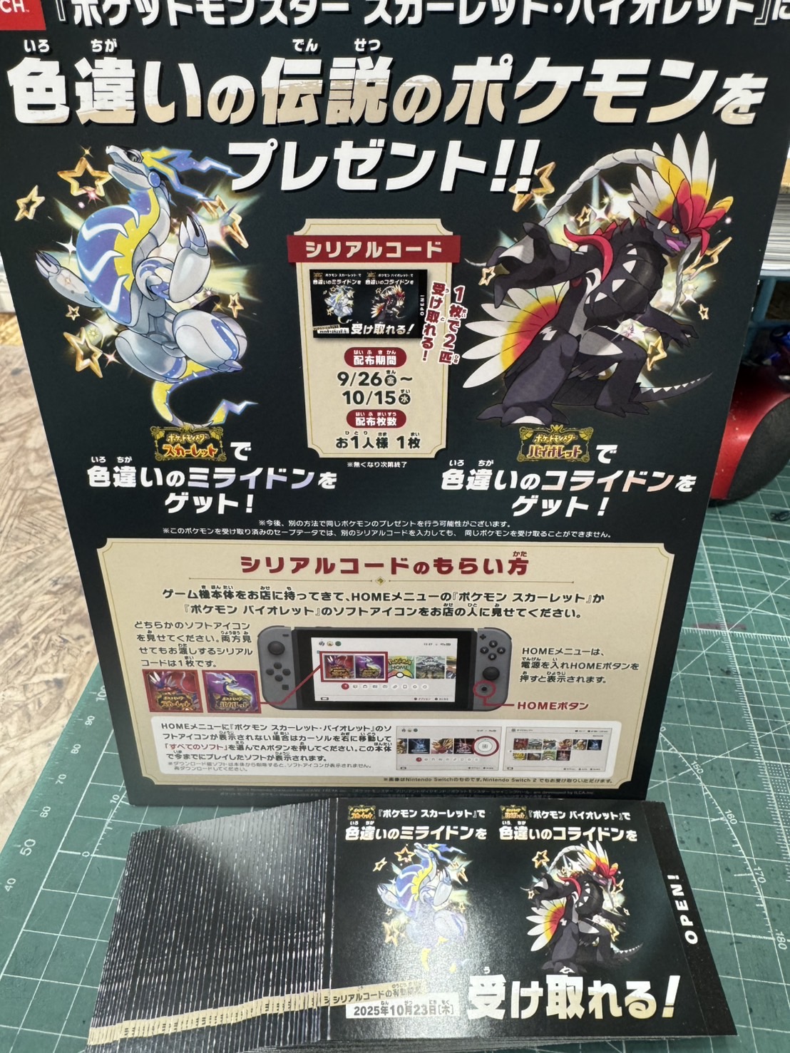 ☆★本日よりスカーレット、バイオレットが入ったSwitch本体をスタッフに見せるとシリアルコードをお渡しいたします‼️★☆ 2025年9月30日 本日よりスカーレット、バイオレットが入ったSwitch本体をスタッフに見せるとシリアルコードをお渡しいたします‼️ 入り口近くのレジスタッフまでSwitchをお見せください👍 おひとり様1枚、1端末で1枚のお渡しとなります。無くなり次第終了となります🙇