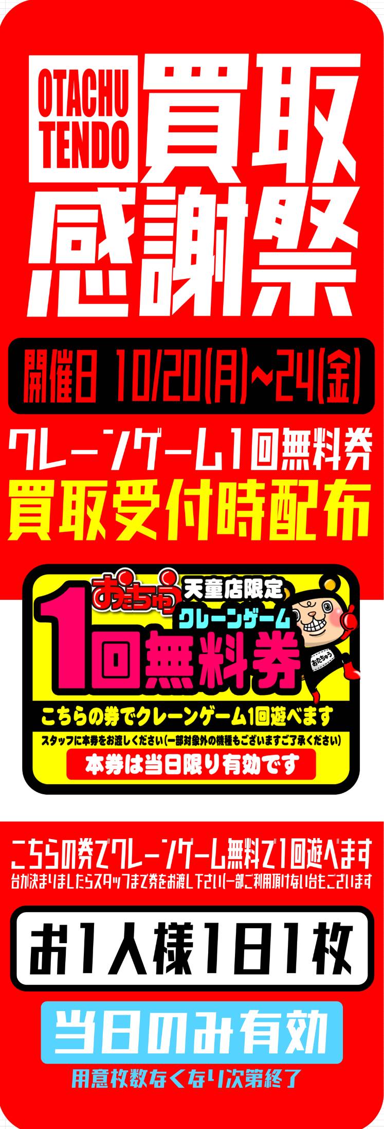 【イベント情報‼️】 10/20(月)~24(金) 買取感謝祭開催‼️ 2025年10月18日 【買取感謝祭開催‼️】 開催日:10/20(月)~10/24(金) 買取り受付時に、クレーンゲーム1回無料券を配布致します🙇 (買取り時間帯のみの配布になります) この機会に是非、クレーンゲームを遊びまくろう‼️ 詳細は、画像をご確認下さい🙇 ************************ こちら↓もぜひチェックしてみてくださいね♪(*´▽`*) ・最新のイベント情報はこちら ・最新の買取情報はこちら