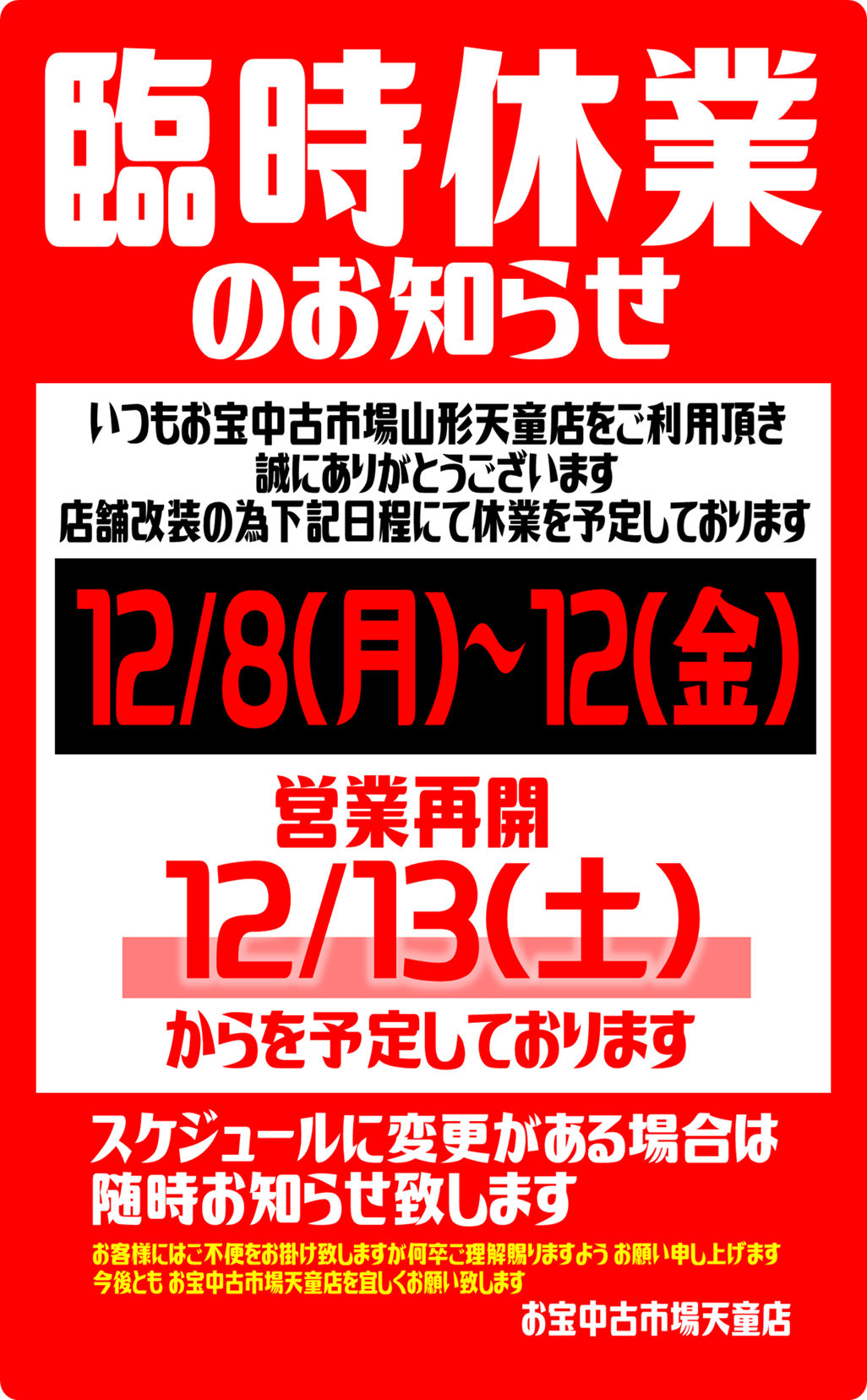 【重要】《12月8日~12日》店舗改装に伴う臨時休業のお知らせ【重要】 2025年11月4日 【重要】《12月8日~12日》店舗改装に伴う臨時休業のお知らせ【重要】 平素より当店をご愛顧いただきまして誠にありがとうございます。 店舗改装の為、2025年12月8日(月)~12月12日(金)まで臨時休業とさせていただきます。 営業再開は2025年12月13日(土)10時を予定しております。 なお、休業期間の駐車場のご利用はできませんので予めご了承ください。 お客様にはご迷惑をおかけいたしますがご理解いただきますようお願い申し上げます。