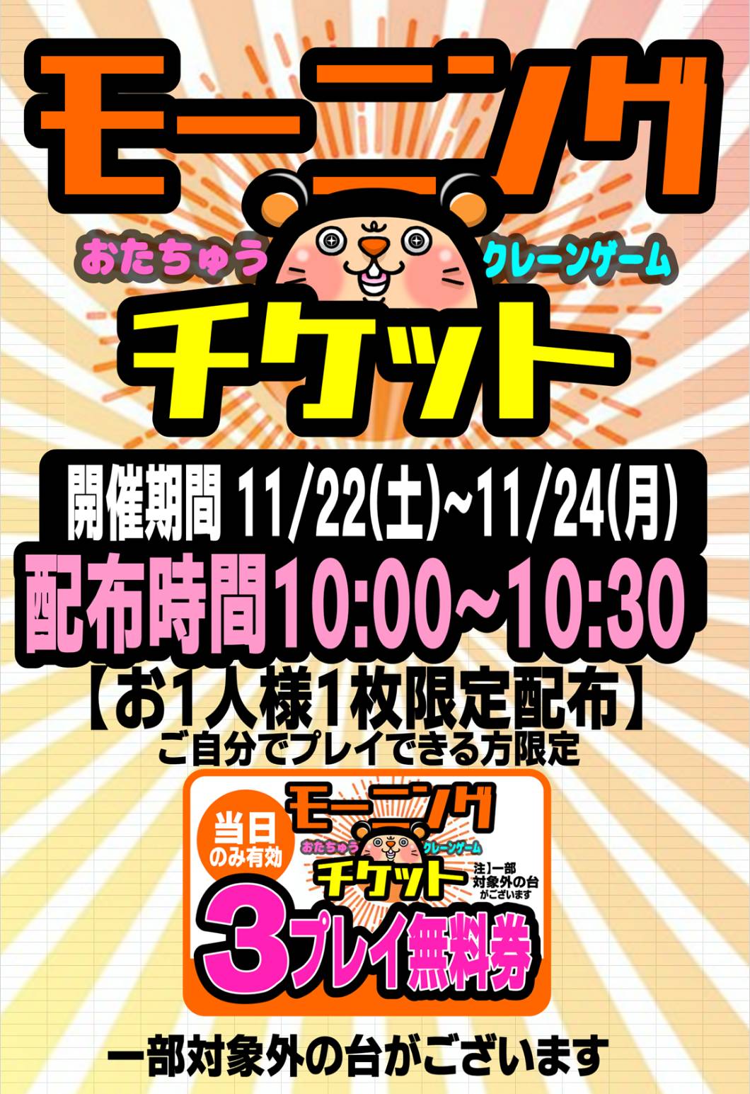 ★《11月22日~24日》午前10:00~10:30までモーニングチケットを配布致します✋★ 2025年11月11日 プライズコーナーからのお知らせ‼️ 11/22(土)~11/24(月) 午前10:00~10:30までモーニングチケットを配布致します✋ モーニングチケットとは、クレーンゲーム3PLAY無料券になります😄 こちら大好評につき、3日連続で無料配布致します‼️‼️‼️ この機会に是非ご来店お待ちしております🙇 ************************ こちら↓もぜひチェックしてみてくださいね♪(*´▽`*) ・最新のイベント情報はこちら ・最新の買取情報はこちら