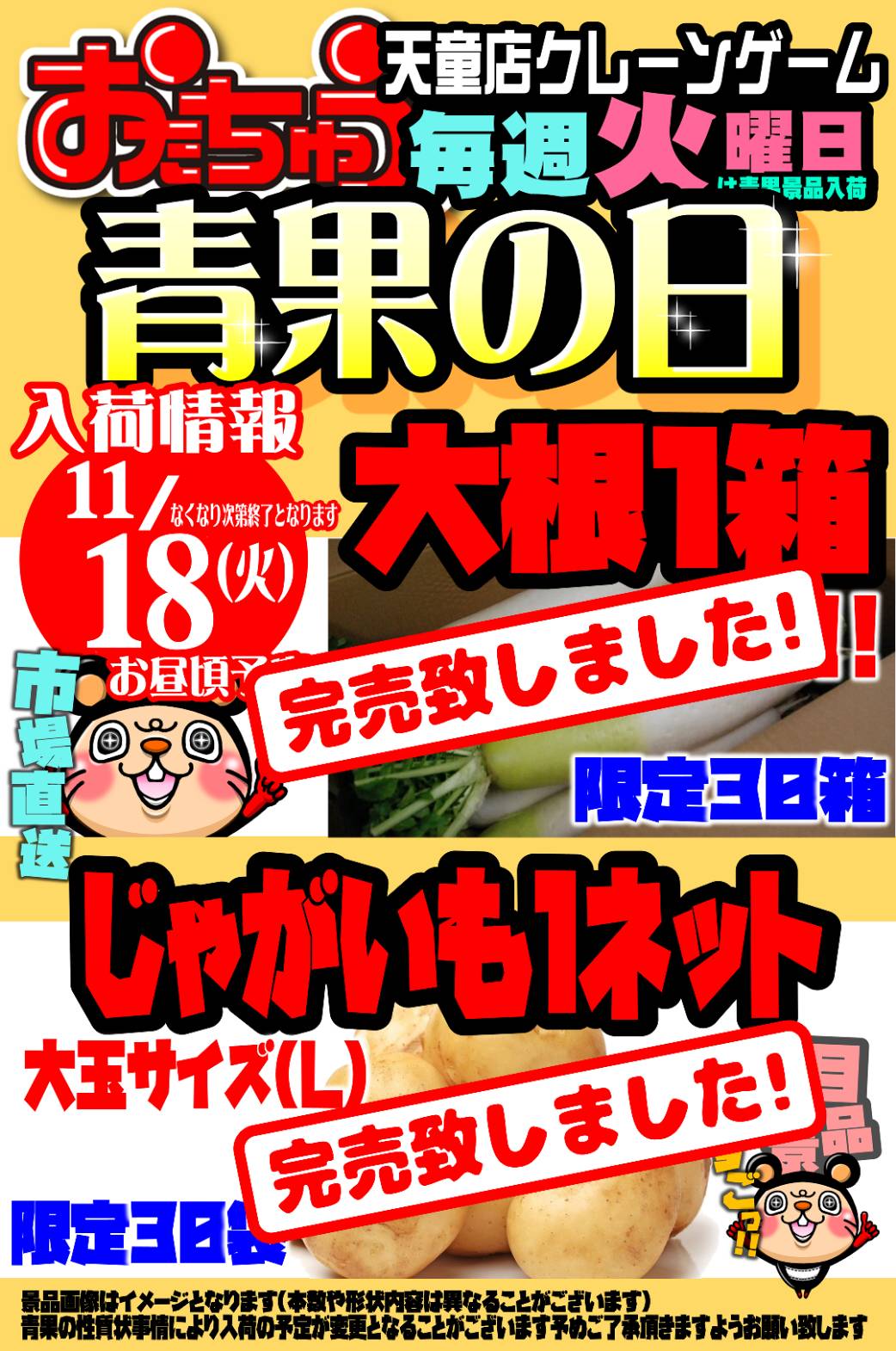 本日入荷した個数限定の「大根」「ジャガイモ」が完売いたしました🥔🥗