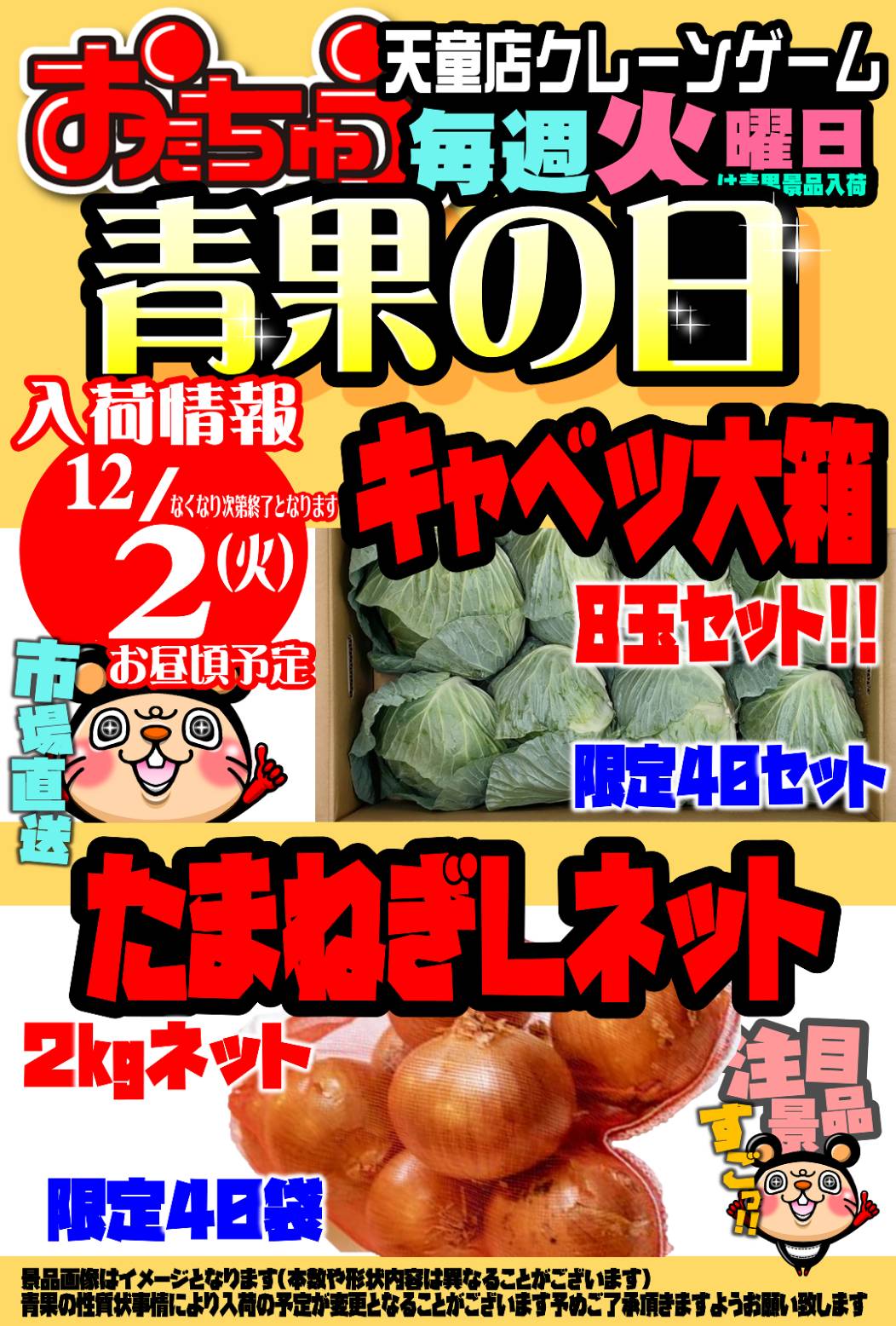 12/2(火)は、新鮮な野菜がクレーンゲームの景品として登場します‼️
