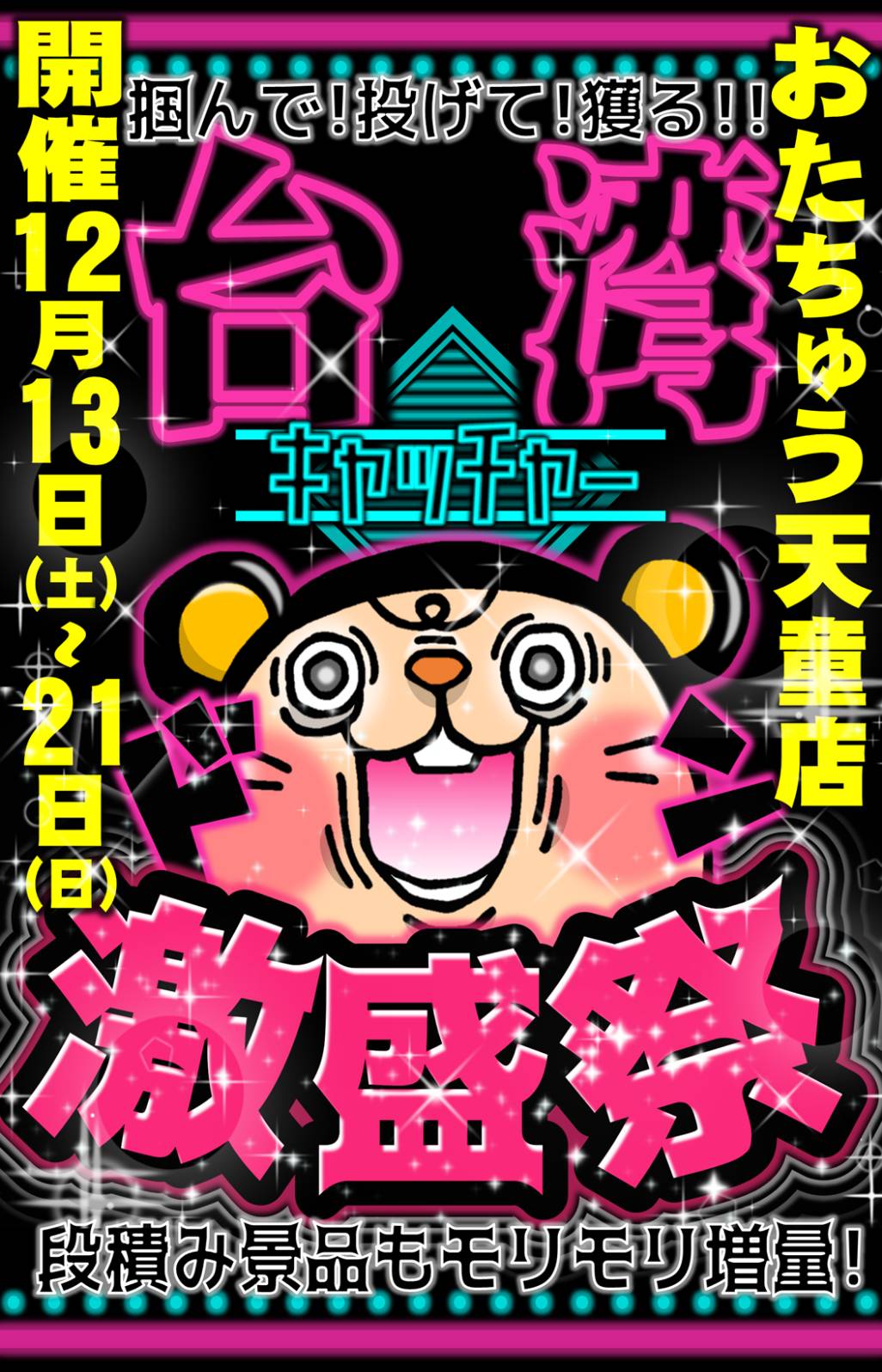 《12/13(土)~12/21(日)》激盛祭 2025年12月7日 【おたちゅうイベント、激盛祭を開催致します‼️】 開催日:12/13(土)~12/21(日) 段積み景品がモリモリで稼働中‼️ 今話題の台湾キャッチャー‼️ 新感覚クレーンゲームであそんじゃおう✋ 詳細は画像をご確認下さい 週末はおたちゅう天童店に遊びに来てください🙇 皆様のご来店お待ちしております‼️ ************************ こちら↓もぜひチェックしてみてくださいね♪(*´▽`*) ・最新のイベント情報はこちら ・最新の買取情報はこちら