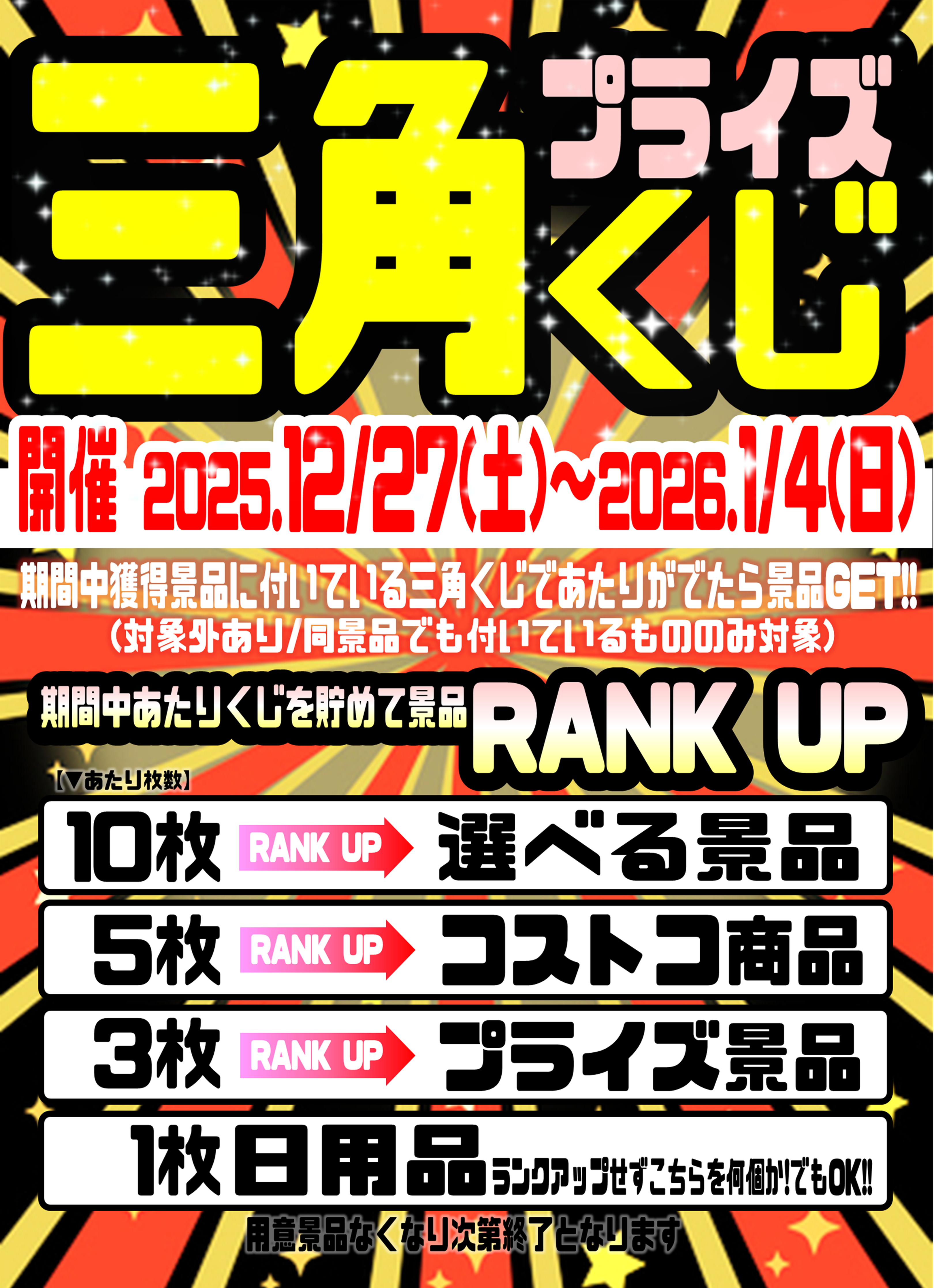 《12/27~1/4》【プライズ三角くじ】 2025年12月20日 【プライズ三角くじ】 2025.12/27(土)~2026.1/4(日)までの期間中 獲得プライズ景品のくじから「当たり」が出たらプラスで景品ゲット! 天童店は「当たり」を集めて景品のランクアップも可能!! 当たり目指して景品ゲットだぁ~✨ ************************ こちら↓もぜひチェックしてみてくださいね♪(*´▽`*) ・最新のイベント情報はこちら ・最新の買取情報はこちら