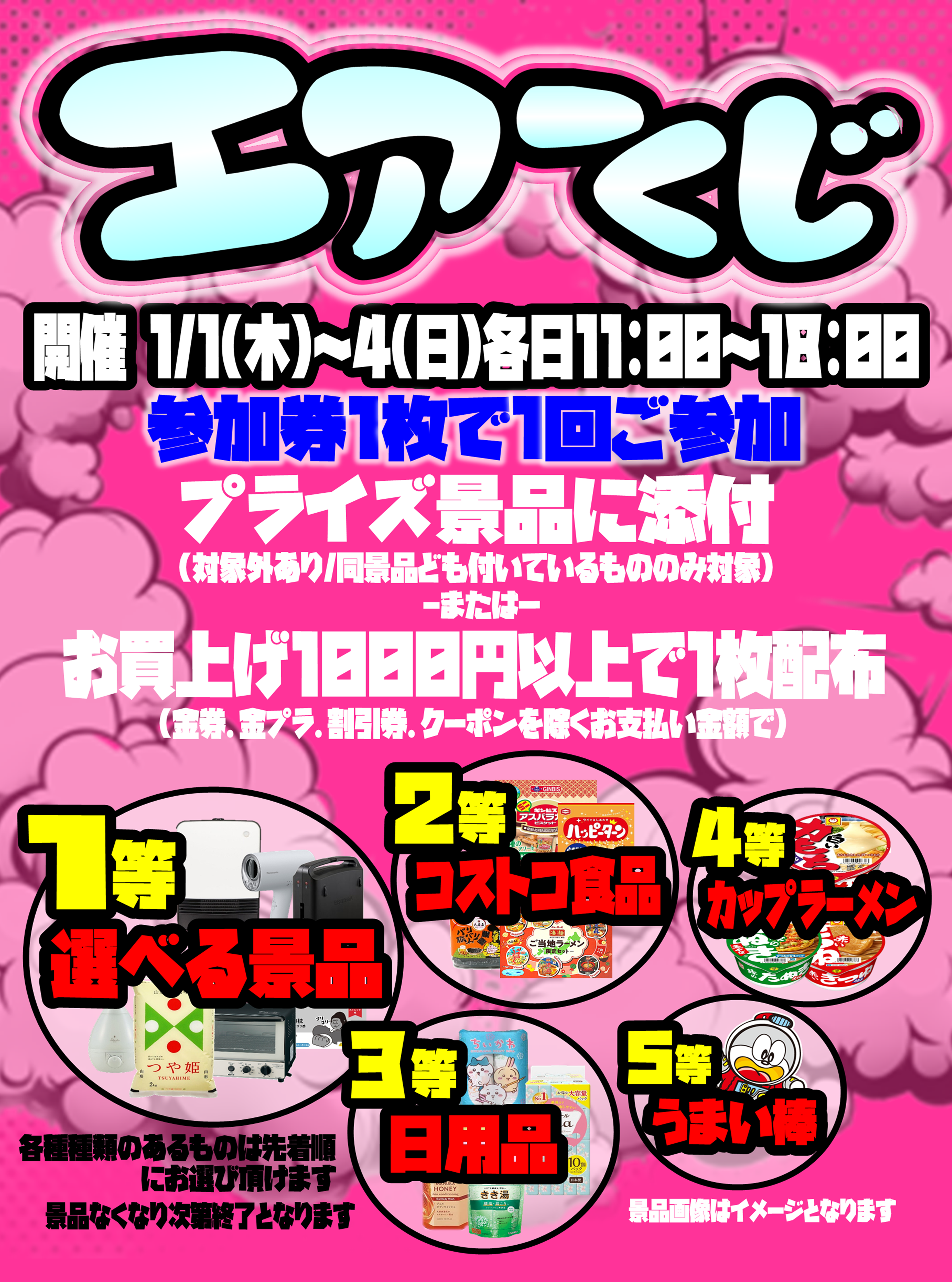 《1/1~1/4》【天童店限定開催エアーくじ】 2025年12月20日 【天童店限定開催エアーくじ】 2026.1/1(木)~1/4(日)各日11:00~18:00 プライズ景品に付いている参加券1枚で1回 レジお買い上げ1000円以上のお客様にも参加券を配布いたします! フワフワ舞うくじを掴み取れ!!! ************************ こちら↓もぜひチェックしてみてくださいね♪(*´▽`*) ・最新のイベント情報はこちら ・最新の買取情報はこちら