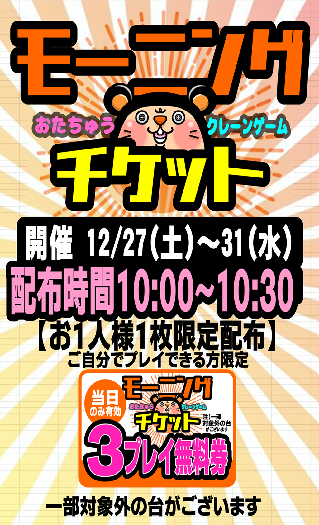 クレーンゲーム3プレイ無料券のことでご自身でプレイできる方なら