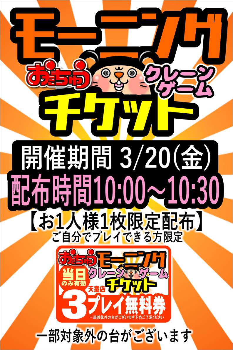 3/20(金) 午前10:00~10:30までモーニングチケットを配布致します✋ 2026年2月28日 プライズコーナーからのお知らせ‼️ 3/20(金) 午前10:00~10:30までモーニングチケットを配布致します✋ モーニングチケットとは、クレーンゲーム3PLAY無料券になります😄 この機会に是非ご来店お待ちしております🙇 ************************ こちら↓もぜひチェックしてみてくださいね♪(*´▽`*) ・最新のイベント情報はこちら ・最新の買取情報はこちら