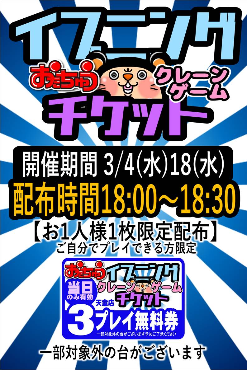 3/4(水)と3/18(水) 午後18:00~18:30までイブニングチケットを配布致します✋ 2026年2月28日 プライズコーナーからのお知らせ‼️ 3/4(水)と3/18(水) 午後18:00~18:30までイブニングチケットを配布致します✋ イブニングチケットとは、クレーンゲーム3PLAY無料券になります😄 この機会に是非ご来店お待ちしております🙇 ************************ こちら↓もぜひチェックしてみてくださいね♪(*´▽`*) ・最新のイベント情報はこちら ・最新の買取情報はこちら