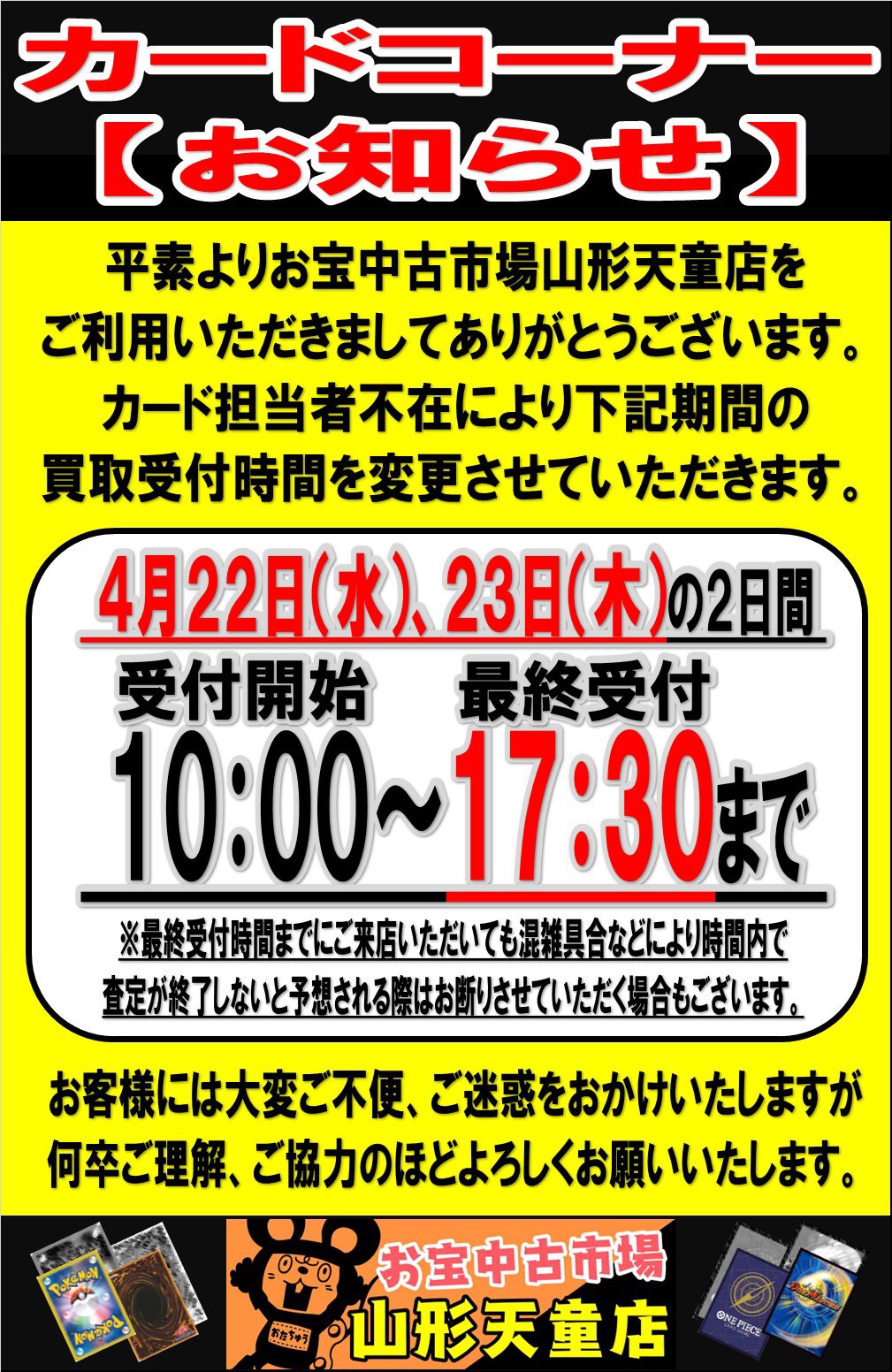 4/22・4/23◆カード 買取受付時間変更のお知らせ